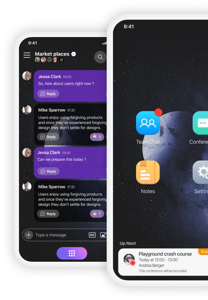 TeamChat und Konferenzfunktionen auf dem Handy. Verfolgen Sie Ihre Diskussionen in TeamChat-Räumen mit optimierten Threads, Dateiteilung und Benachrichtigungen für verfolgte Themen. Sie können von überall an Besprechungen teilnehmen, sie veranstalten oder planen, einschließlich Aufzeichnung und Bildschirmfreigabe. Erfahren Sie mehr.